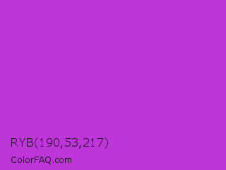 RYB 190,53,217 Color is a normal purple color and the nearest color is Steel Pink #cc33cc. Hex code #be35d9 and RGB value is rgb(190,53,217). In RGB color space, this color is composed of 75% red, 21% green, 85% blue, In CMYK color space, this color is composed of 12% cyan, 76% magenta, 0% yellow , 15% black , In HSL color space, this color has a hue angle of 290° , 68% saturation and 53% lightness.