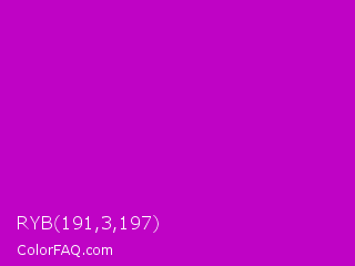 RYB 191,3,197 Color is a normal magenta color and the nearest color is Deep Magenta #cc00cc. Hex code #bf03c5 and RGB value is rgb(191,3,197). In RGB color space, this color is composed of 75% red, 1% green, 77% blue, In CMYK color space, this color is composed of 3% cyan, 98% magenta, 0% yellow , 23% black , In HSL color space, this color has a hue angle of 298° , 97% saturation and 39% lightness.