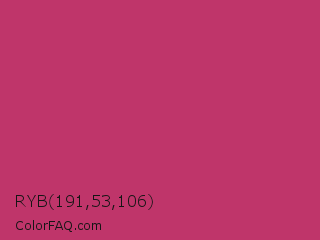 RYB 191,53,106 Color is a normal rose color and the nearest color is Hibiscus #b6316c. Hex code #bf356a and RGB value is rgb(191,53,106). In RGB color space, this color is composed of 75% red, 21% green, 42% blue, In CMYK color space, this color is composed of 0% cyan, 72% magenta, 45% yellow , 25% black , In HSL color space, this color has a hue angle of 337° , 57% saturation and 48% lightness.