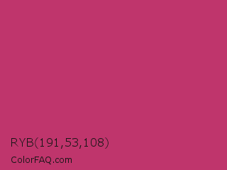 RYB 191,53,108 Color is a normal rose color and the nearest color is Hibiscus #b6316c. Hex code #bf356c and RGB value is rgb(191,53,108). In RGB color space, this color is composed of 75% red, 21% green, 42% blue, In CMYK color space, this color is composed of 0% cyan, 72% magenta, 43% yellow , 25% black , In HSL color space, this color has a hue angle of 336° , 57% saturation and 48% lightness.