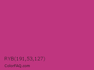 RYB 191,53,127 Color is a normal rose color and the nearest color is Medium Red Violet #bb3385. Hex code #bf357f and RGB value is rgb(191,53,127). In RGB color space, this color is composed of 75% red, 21% green, 50% blue, In CMYK color space, this color is composed of 0% cyan, 72% magenta, 34% yellow , 25% black , In HSL color space, this color has a hue angle of 328° , 57% saturation and 48% lightness.