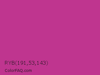 RYB 191,53,143 Color is a normal magenta color and the nearest color is Medium Red Violet #bb3385. Hex code #bf358f and RGB value is rgb(191,53,143). In RGB color space, this color is composed of 75% red, 21% green, 56% blue, In CMYK color space, this color is composed of 0% cyan, 72% magenta, 25% yellow , 25% black , In HSL color space, this color has a hue angle of 321° , 57% saturation and 48% lightness.