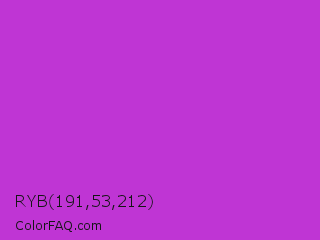 RYB 191,53,212 Color is a normal magenta color and the nearest color is Steel Pink #cc33cc. Hex code #bf35d4 and RGB value is rgb(191,53,212). In RGB color space, this color is composed of 75% red, 21% green, 83% blue, In CMYK color space, this color is composed of 10% cyan, 75% magenta, 0% yellow , 17% black , In HSL color space, this color has a hue angle of 292° , 65% saturation and 52% lightness.