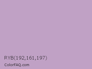 RYB 192,161,197 Color is a light magenta color and the nearest color is London Hue #bea6c3. Hex code #c0a1c5 and RGB value is rgb(192,161,197). In RGB color space, this color is composed of 75% red, 63% green, 77% blue, In CMYK color space, this color is composed of 3% cyan, 18% magenta, 0% yellow , 23% black , In HSL color space, this color has a hue angle of 292° , 24% saturation and 70% lightness.