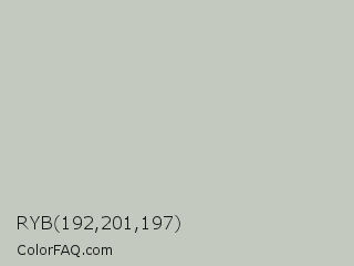 RYB 192,201,197 Color is a light green color and the nearest color is Kangaroo #c6c8bd. Hex code #c4c9c0 and RGB value is rgb(196,201,192). In RGB color space, this color is composed of 77% red, 79% green, 75% blue, In CMYK color space, this color is composed of 2% cyan, 0% magenta, 4% yellow , 21% black , In HSL color space, this color has a hue angle of 93° , 8% saturation and 77% lightness.
