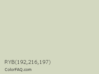RYB 192,216,197 Color is a light lime color and the nearest color is Tana #d9dcc1. Hex code #d3d8c0 and RGB value is rgb(211,216,192). In RGB color space, this color is composed of 83% red, 85% green, 75% blue, In CMYK color space, this color is composed of 2% cyan, 0% magenta, 11% yellow , 15% black , In HSL color space, this color has a hue angle of 73° , 24% saturation and 80% lightness.