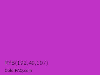 RYB 192,49,197 Color is a normal magenta color and the nearest color is Steel Pink #cc33cc. Hex code #c031c5 and RGB value is rgb(192,49,197). In RGB color space, this color is composed of 75% red, 19% green, 77% blue, In CMYK color space, this color is composed of 3% cyan, 75% magenta, 0% yellow , 23% black , In HSL color space, this color has a hue angle of 298° , 60% saturation and 48% lightness.