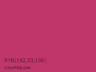 RYB 192,53,106 Color is a normal rose color and the nearest color is Hibiscus #b6316c. Hex code #c0356a and RGB value is rgb(192,53,106). In RGB color space, this color is composed of 75% red, 21% green, 42% blue, In CMYK color space, this color is composed of 0% cyan, 72% magenta, 45% yellow , 25% black , In HSL color space, this color has a hue angle of 337° , 57% saturation and 48% lightness.