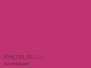 RYB 192,53,111 Color is a normal rose color and the nearest color is Hibiscus #b6316c. Hex code #c0356f and RGB value is rgb(192,53,111). In RGB color space, this color is composed of 75% red, 21% green, 44% blue, In CMYK color space, this color is composed of 0% cyan, 72% magenta, 42% yellow , 25% black , In HSL color space, this color has a hue angle of 335° , 57% saturation and 48% lightness.