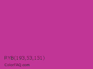 RYB 193,53,151 Color is a normal magenta color and the nearest color is Royal Fuchsia #ca2c92. Hex code #c13597 and RGB value is rgb(193,53,151). In RGB color space, this color is composed of 76% red, 21% green, 59% blue, In CMYK color space, this color is composed of 0% cyan, 73% magenta, 22% yellow , 24% black , In HSL color space, this color has a hue angle of 318° , 57% saturation and 48% lightness.