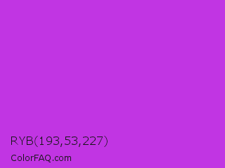 RYB 193,53,227 Color is a normal purple color and the nearest color is Steel Pink #cc33cc. Hex code #c135e3 and RGB value is rgb(193,53,227). In RGB color space, this color is composed of 76% red, 21% green, 89% blue, In CMYK color space, this color is composed of 15% cyan, 77% magenta, 0% yellow , 11% black , In HSL color space, this color has a hue angle of 288° , 76% saturation and 55% lightness.