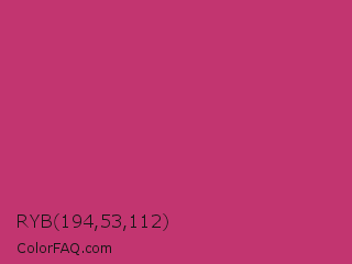 RYB 194,53,112 Color is a normal rose color and the nearest color is Hibiscus #b6316c. Hex code #c23570 and RGB value is rgb(194,53,112). In RGB color space, this color is composed of 76% red, 21% green, 44% blue, In CMYK color space, this color is composed of 0% cyan, 73% magenta, 42% yellow , 24% black , In HSL color space, this color has a hue angle of 335° , 57% saturation and 48% lightness.