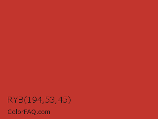 RYB 194,53,45 Color is a normal red color and the nearest color is International Orange Golden Gate Bridge #c0362c. Hex code #c2352d and RGB value is rgb(194,53,45). In RGB color space, this color is composed of 76% red, 21% green, 18% blue, In CMYK color space, this color is composed of 0% cyan, 73% magenta, 77% yellow , 24% black , In HSL color space, this color has a hue angle of 3° , 62% saturation and 47% lightness.