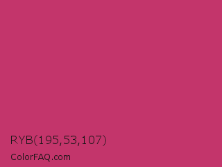 RYB 195,53,107 Color is a normal rose color and the nearest color is Hibiscus #b6316c. Hex code #c3356b and RGB value is rgb(195,53,107). In RGB color space, this color is composed of 76% red, 21% green, 42% blue, In CMYK color space, this color is composed of 0% cyan, 73% magenta, 45% yellow , 24% black , In HSL color space, this color has a hue angle of 337° , 57% saturation and 49% lightness.