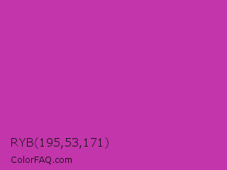 RYB 195,53,171 Color is a normal magenta color and the nearest color is Byzantine #bd33a4. Hex code #c335ab and RGB value is rgb(195,53,171). In RGB color space, this color is composed of 76% red, 21% green, 67% blue, In CMYK color space, this color is composed of 0% cyan, 73% magenta, 12% yellow , 24% black , In HSL color space, this color has a hue angle of 310° , 57% saturation and 49% lightness.