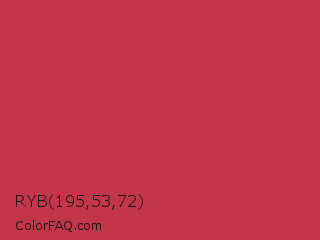 RYB 195,53,72 Color is a normal red color and the nearest color is French Raspberry #c72c48. Hex code #c33548 and RGB value is rgb(195,53,72). In RGB color space, this color is composed of 76% red, 21% green, 28% blue, In CMYK color space, this color is composed of 0% cyan, 73% magenta, 63% yellow , 24% black , In HSL color space, this color has a hue angle of 352° , 57% saturation and 49% lightness.