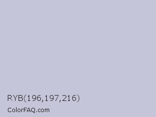 RYB 196,197,216 Color is a very light blue color and the nearest color is Ghost #c7c9d5. Hex code #c4c5d8 and RGB value is rgb(196,197,216). In RGB color space, this color is composed of 77% red, 77% green, 85% blue, In CMYK color space, this color is composed of 9% cyan, 9% magenta, 0% yellow , 15% black , In HSL color space, this color has a hue angle of 237° , 20% saturation and 81% lightness.