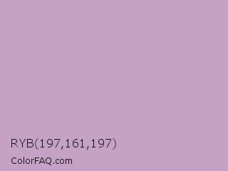 RYB 197,161,197 Color is a light magenta color and the nearest color is Lilac #c8a2c8. Hex code #c5a1c5 and RGB value is rgb(197,161,197). In RGB color space, this color is composed of 77% red, 63% green, 77% blue, In CMYK color space, this color is composed of 0% cyan, 18% magenta, 0% yellow , 23% black , In HSL color space, this color has a hue angle of 300° , 24% saturation and 70% lightness.