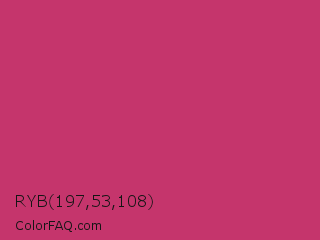 RYB 197,53,108 Color is a normal rose color and the nearest color is Telemagenta #cf3476. Hex code #c5356c and RGB value is rgb(197,53,108). In RGB color space, this color is composed of 77% red, 21% green, 42% blue, In CMYK color space, this color is composed of 0% cyan, 73% magenta, 45% yellow , 23% black , In HSL color space, this color has a hue angle of 337° , 58% saturation and 49% lightness.