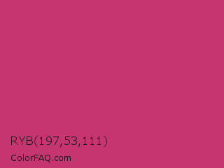 RYB 197,53,111 Color is a normal rose color and the nearest color is Telemagenta #cf3476. Hex code #c5356f and RGB value is rgb(197,53,111). In RGB color space, this color is composed of 77% red, 21% green, 44% blue, In CMYK color space, this color is composed of 0% cyan, 73% magenta, 44% yellow , 23% black , In HSL color space, this color has a hue angle of 336° , 58% saturation and 49% lightness.