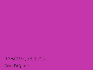 RYB 197,53,171 Color is a normal magenta color and the nearest color is Byzantine #bd33a4. Hex code #c535ab and RGB value is rgb(197,53,171). In RGB color space, this color is composed of 77% red, 21% green, 67% blue, In CMYK color space, this color is composed of 0% cyan, 73% magenta, 13% yellow , 23% black , In HSL color space, this color has a hue angle of 311° , 58% saturation and 49% lightness.