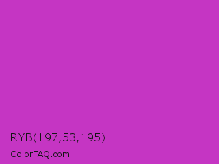 RYB 197,53,195 Color is a normal magenta color and the nearest color is Steel Pink #cc33cc. Hex code #c535c3 and RGB value is rgb(197,53,195). In RGB color space, this color is composed of 77% red, 21% green, 76% blue, In CMYK color space, this color is composed of 0% cyan, 73% magenta, 1% yellow , 23% black , In HSL color space, this color has a hue angle of 301° , 58% saturation and 49% lightness.