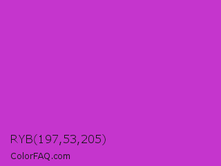 RYB 197,53,205 Color is a normal magenta color and the nearest color is Steel Pink #cc33cc. Hex code #c535cd and RGB value is rgb(197,53,205). In RGB color space, this color is composed of 77% red, 21% green, 80% blue, In CMYK color space, this color is composed of 4% cyan, 74% magenta, 0% yellow , 20% black , In HSL color space, this color has a hue angle of 297° , 60% saturation and 51% lightness.