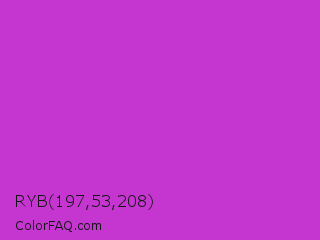 RYB 197,53,208 Color is a normal magenta color and the nearest color is Steel Pink #cc33cc. Hex code #c535d0 and RGB value is rgb(197,53,208). In RGB color space, this color is composed of 77% red, 21% green, 82% blue, In CMYK color space, this color is composed of 5% cyan, 75% magenta, 0% yellow , 18% black , In HSL color space, this color has a hue angle of 296° , 62% saturation and 51% lightness.