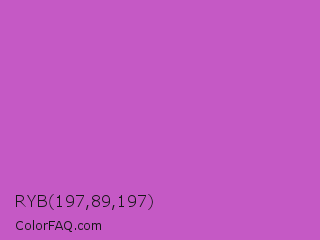 RYB 197,89,197 Color is a normal magenta color and the nearest color is Fuchsia Pink #c154c1. Hex code #c559c5 and RGB value is rgb(197,89,197). In RGB color space, this color is composed of 77% red, 35% green, 77% blue, In CMYK color space, this color is composed of 0% cyan, 55% magenta, 0% yellow , 23% black , In HSL color space, this color has a hue angle of 300° , 48% saturation and 56% lightness.