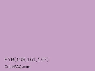 RYB 198,161,197 Color is a light magenta color and the nearest color is Lilac #c8a2c8. Hex code #c6a1c5 and RGB value is rgb(198,161,197). In RGB color space, this color is composed of 78% red, 63% green, 77% blue, In CMYK color space, this color is composed of 0% cyan, 19% magenta, 1% yellow , 22% black , In HSL color space, this color has a hue angle of 302° , 25% saturation and 70% lightness.