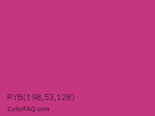 RYB 198,53,128 Color is a normal rose color and the nearest color is Fuchsia Purple #cc397b. Hex code #c63580 and RGB value is rgb(198,53,128). In RGB color space, this color is composed of 78% red, 21% green, 50% blue, In CMYK color space, this color is composed of 0% cyan, 73% magenta, 35% yellow , 22% black , In HSL color space, this color has a hue angle of 329° , 58% saturation and 49% lightness.