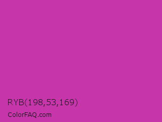 RYB 198,53,169 Color is a normal magenta color and the nearest color is Byzantine #bd33a4. Hex code #c635a9 and RGB value is rgb(198,53,169). In RGB color space, this color is composed of 78% red, 21% green, 66% blue, In CMYK color space, this color is composed of 0% cyan, 73% magenta, 15% yellow , 22% black , In HSL color space, this color has a hue angle of 312° , 58% saturation and 49% lightness.