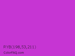 RYB 198,53,211 Color is a normal magenta color and the nearest color is Steel Pink #cc33cc. Hex code #c635d3 and RGB value is rgb(198,53,211). In RGB color space, this color is composed of 78% red, 21% green, 83% blue, In CMYK color space, this color is composed of 6% cyan, 75% magenta, 0% yellow , 17% black , In HSL color space, this color has a hue angle of 295° , 64% saturation and 52% lightness.