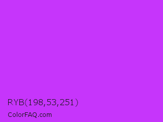 RYB 198,53,251 Color is a normal purple color and the nearest color is Veronica #a020f0. Hex code #c635fb and RGB value is rgb(198,53,251). In RGB color space, this color is composed of 78% red, 21% green, 98% blue, In CMYK color space, this color is composed of 21% cyan, 79% magenta, 0% yellow , 2% black , In HSL color space, this color has a hue angle of 284° , 96% saturation and 60% lightness.