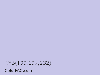 RYB 199,197,232 Color is a very light indigo color and the nearest color is Periwinkle Gray #c3cde6. Hex code #c7c5e8 and RGB value is rgb(199,197,232). In RGB color space, this color is composed of 78% red, 77% green, 91% blue, In CMYK color space, this color is composed of 14% cyan, 15% magenta, 0% yellow , 9% black , In HSL color space, this color has a hue angle of 243° , 43% saturation and 84% lightness.