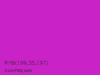 RYB 199,35,197 Color is a normal magenta color and the nearest color is Steel Pink #cc33cc. Hex code #c723c5 and RGB value is rgb(199,35,197). In RGB color space, this color is composed of 78% red, 14% green, 77% blue, In CMYK color space, this color is composed of 0% cyan, 82% magenta, 1% yellow , 22% black , In HSL color space, this color has a hue angle of 301° , 70% saturation and 46% lightness.