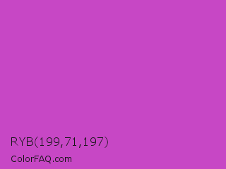 RYB 199,71,197 Color is a normal magenta color and the nearest color is Fuchsia Pink #c154c1. Hex code #c747c5 and RGB value is rgb(199,71,197). In RGB color space, this color is composed of 78% red, 28% green, 77% blue, In CMYK color space, this color is composed of 0% cyan, 64% magenta, 1% yellow , 22% black , In HSL color space, this color has a hue angle of 301° , 53% saturation and 53% lightness.