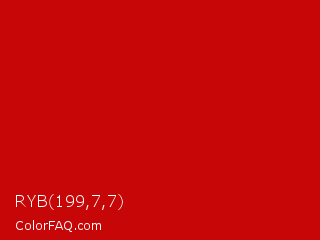 RYB 199,7,7 Color is a normal red color and the nearest color is Boston University Red #cc0000. Hex code #c70707 and RGB value is rgb(199,7,7). In RGB color space, this color is composed of 78% red, 3% green, 3% blue, In CMYK color space, this color is composed of 0% cyan, 96% magenta, 96% yellow , 22% black , In HSL color space, this color has a hue angle of 0° , 93% saturation and 40% lightness.