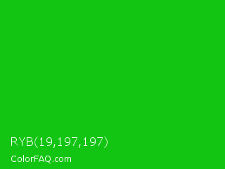 RYB 19,197,197 Color is a normal green color and the nearest color is Vivid Malachite #00cc33. Hex code #13c513 and RGB value is rgb(19,197,19). In RGB color space, this color is composed of 7% red, 77% green, 7% blue, In CMYK color space, this color is composed of 90% cyan, 0% magenta, 90% yellow , 23% black , In HSL color space, this color has a hue angle of 120° , 82% saturation and 42% lightness.