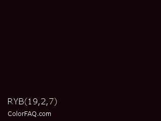 RYB 19,2,7 Color is a almost black rose color and the nearest color is Diesel #130000. Hex code #130207 and RGB value is rgb(19,2,7). In RGB color space, this color is composed of 7% red, 1% green, 3% blue, In CMYK color space, this color is composed of 0% cyan, 89% magenta, 63% yellow , 93% black , In HSL color space, this color has a hue angle of 342° , 81% saturation and 4% lightness.