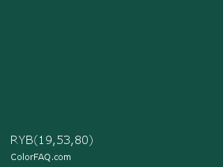 RYB 19,53,80 Color is a very dark cyan color and the nearest color is Brunswick Green #1b4d3e. Hex code #135043 and RGB value is rgb(19,80,67). In RGB color space, this color is composed of 7% red, 31% green, 26% blue, In CMYK color space, this color is composed of 76% cyan, 0% magenta, 16% yellow , 69% black , In HSL color space, this color has a hue angle of 167° , 62% saturation and 19% lightness.