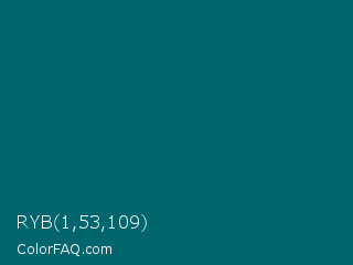 RYB 1,53,109 Color is a very dark cyan color and the nearest color is Mosque #036a6e. Hex code #01656d and RGB value is rgb(1,101,109). In RGB color space, this color is composed of 0% red, 40% green, 43% blue, In CMYK color space, this color is composed of 99% cyan, 7% magenta, 0% yellow , 57% black , In HSL color space, this color has a hue angle of 184° , 98% saturation and 22% lightness.