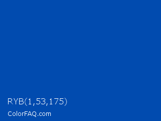 RYB 1,53,175 Color is a normal blue color and the nearest color is Cobalt #0047ab. Hex code #014baf and RGB value is rgb(1,75,175). In RGB color space, this color is composed of 0% red, 29% green, 69% blue, In CMYK color space, this color is composed of 99% cyan, 57% magenta, 0% yellow , 31% black , In HSL color space, this color has a hue angle of 214° , 99% saturation and 35% lightness.