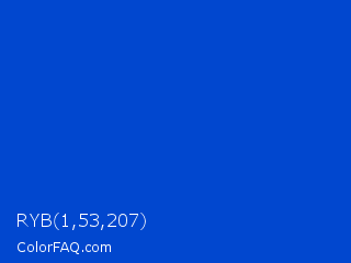 RYB 1,53,207 Color is a normal blue color and the nearest color is Absolute Zero #0048ba. Hex code #0147cf and RGB value is rgb(1,71,207). In RGB color space, this color is composed of 0% red, 28% green, 81% blue, In CMYK color space, this color is composed of 100% cyan, 66% magenta, 0% yellow , 19% black , In HSL color space, this color has a hue angle of 220° , 99% saturation and 41% lightness.
