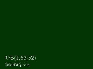 RYB 1,53,52 Color is a very dark green color and the nearest color is Deep Fir #002900. Hex code #023501 and RGB value is rgb(2,53,1). In RGB color space, this color is composed of 1% red, 21% green, 0% blue, In CMYK color space, this color is composed of 96% cyan, 0% magenta, 98% yellow , 79% black , In HSL color space, this color has a hue angle of 119° , 96% saturation and 11% lightness.