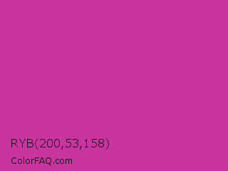 RYB 200,53,158 Color is a normal magenta color and the nearest color is Byzantine #bd33a4. Hex code #c8359e and RGB value is rgb(200,53,158). In RGB color space, this color is composed of 78% red, 21% green, 62% blue, In CMYK color space, this color is composed of 0% cyan, 74% magenta, 21% yellow , 22% black , In HSL color space, this color has a hue angle of 317° , 58% saturation and 50% lightness.