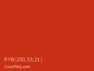 RYB 200,53,21 Color is a normal red color and the nearest color is Thunderbird #c02b18. Hex code #c83015 and RGB value is rgb(200,48,21). In RGB color space, this color is composed of 78% red, 19% green, 8% blue, In CMYK color space, this color is composed of 0% cyan, 76% magenta, 90% yellow , 22% black , In HSL color space, this color has a hue angle of 9° , 81% saturation and 43% lightness.
