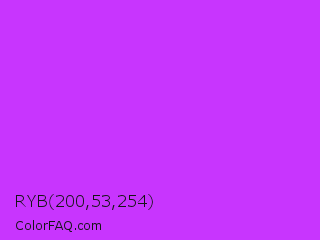 RYB 200,53,254 Color is a normal purple color and the nearest color is Veronica #a020f0. Hex code #c835fe and RGB value is rgb(200,53,254). In RGB color space, this color is composed of 78% red, 21% green, 100% blue, In CMYK color space, this color is composed of 21% cyan, 79% magenta, 0% yellow , 0% black , In HSL color space, this color has a hue angle of 284° , 99% saturation and 60% lightness.