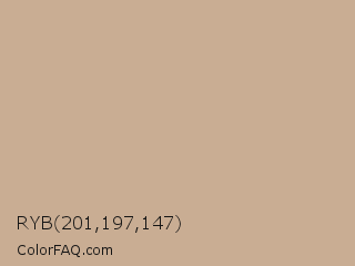 RYB 201,197,147 Color is a light orange color and the nearest color is Indian Khaki #c3b091. Hex code #c9ad93 and RGB value is rgb(201,173,147). In RGB color space, this color is composed of 79% red, 68% green, 58% blue, In CMYK color space, this color is composed of 0% cyan, 14% magenta, 27% yellow , 21% black , In HSL color space, this color has a hue angle of 29° , 33% saturation and 68% lightness.