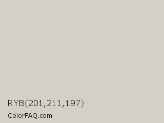 RYB 201,211,197 Color is a light yellow color and the nearest color is Swirl #d3cdc5. Hex code #d3d0c5 and RGB value is rgb(211,208,197). In RGB color space, this color is composed of 83% red, 82% green, 77% blue, In CMYK color space, this color is composed of 0% cyan, 1% magenta, 7% yellow , 17% black , In HSL color space, this color has a hue angle of 47° , 14% saturation and 80% lightness.